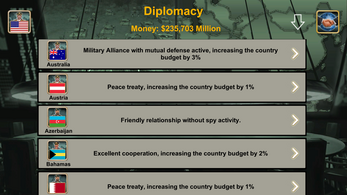 The game is based on single player against very smart Artificial Intelligence system that represent today events and countries status. Our team collecting and updating daily the countries status based on real data: economy, relations, army status etc...