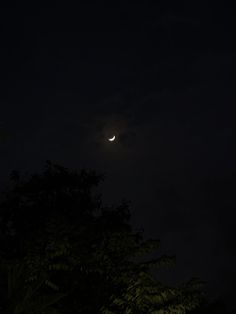 the moon is shining brightly in the dark sky above some trees and bushes at night