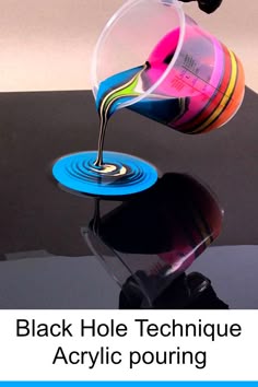 a black hole technique acrylic pouring from a cup into a blue circle with the words, black hole technique acrylic pouring out
