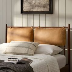 This may contain: a bed with two pillows on top of it next to a night stand and lamp