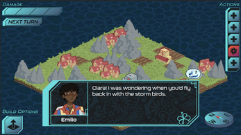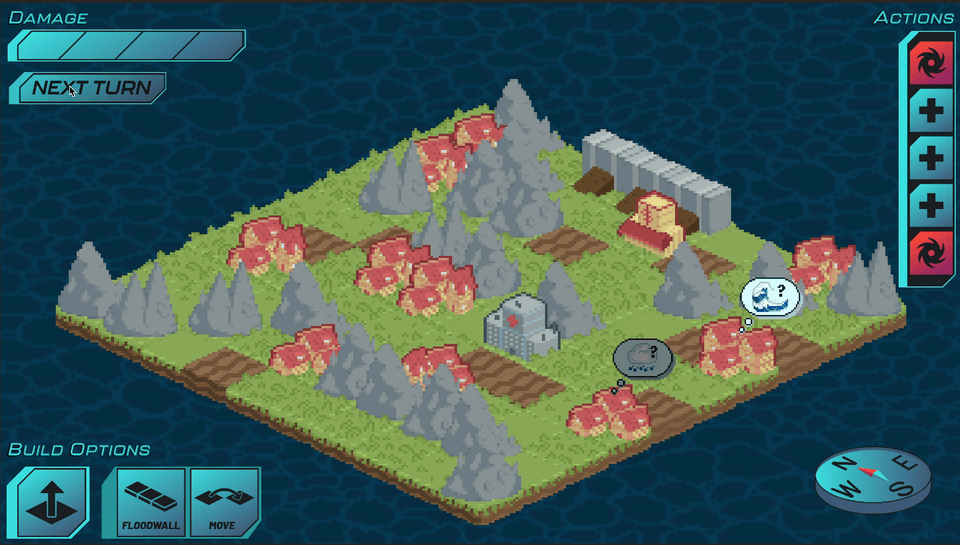The island is facing immense flooding and an oncoming storm, and needs protection. The islanders have faced these challenges before and have gotten good at understanding when a disaster is going to come. Talk to islanders by clicking on dialogue bubbles in the map. Once you know where a disaster is coming from and whether or not it's a flood or a storm, you can plan accordingly using the build menu. You can build flood walls by clicking on the flood wall button and selecting a valid tile on the map, or you can swap two valid tiles by clicking on the move button and either clicking on two tiles, or by dragging one tile to the position of another. If you think you've planned enough, you can click the next phase button to move to the next phase. A disaster will come in and you can see if you've planned well! Once a disaster is over, make sure the next phase button is pressed so you can go to the next turn!