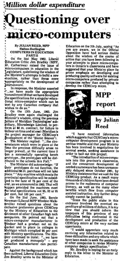 They created the GEMS subsidy (Grant Eligible Microcomputer System) with special requirements as to hardware, Canadian content and an approach to computing that supported the Ministry’s approach to education. Only the Cemcorp consortium’s ICON computer was eligible at first. Schoolboards that bought a GEMS-qualifying computer system would have the Province reimburse 75% of the cost.