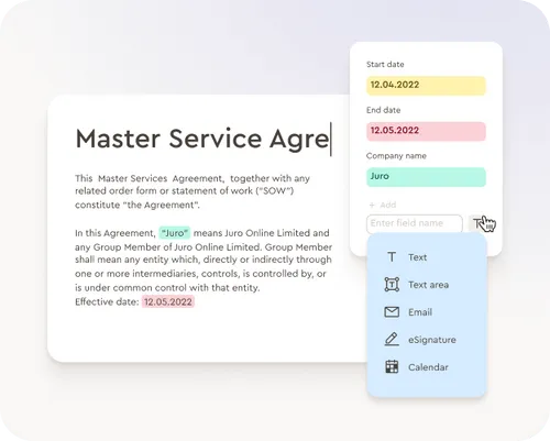 Never miss a renewal date again. Avoid costly auto-renewals and track obligations as you scale thanks to Juro's smartfields and data layer.