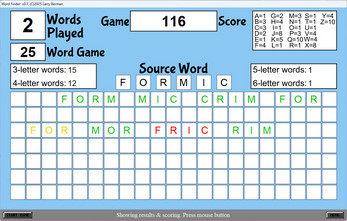 After beginning a new game the computer will scan through its huge 6-letter word dictionary and come up with a SOURCE word to play and display it directly above the 7 rows of boxes used to place letters. It will also calculate how many 3, 4, 5, & 6 letter words that can be created using only the 6 letters in the SOURCE word box and display the totals in the left & right boxes directly above the 7 rows of placement boxes. Use the standard Windows drag'n'drop method to pick up each letter and place it on the below boxes making all the words possible. Once you are done you can click the DONE button at which time the computer will scan through your entire board of letters and determine if you used the correct available letters but also see if it is a word within it's dictionaries. All correct words will score based on the point value of each letter plus bonus points based on each word size. High score saving, great graphics & sound make this game quite fun as well as educational.