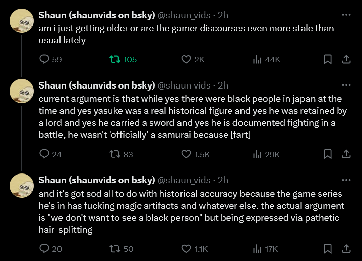 This is some of the worst discourse Iāve seen. I went to the latest Asmongold video about this topic and asked as many people as I could to explain how a black protagonist is pushing an agenda. Not replies. Guess it is hard to explain without claiming ānot historically accurateā or just sounding like a white supremacist.