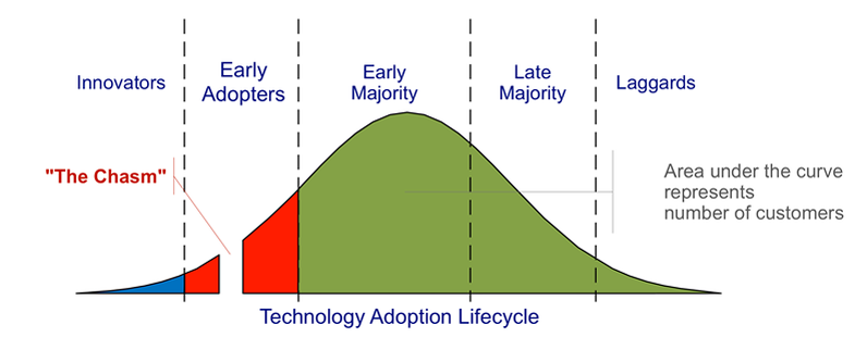 The Technology Adoption Lifecycle[11] is a very famous bell curve describing how new technology spreads. For disruptive innovation, such as a revolutionary new technology product, author Geoffrey Moore has argued[12] in Crossing the Chasm that there is a gap between the early adopters and the early majority. This curve[13] looks like this: