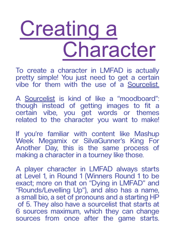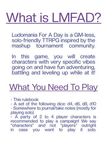 LUDOMANIA FOR A DAY (also LMFAD) is a solo-friendly, GMLess TTRPG where you make varied characters, assign them sourcelists (which will point out what they're good at; their stats of sorts, though much more... music-flavoured) and have fun doing stories, be it in solo journaling format or playing it with friends.