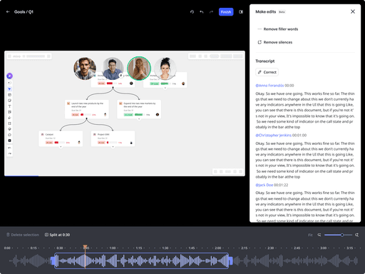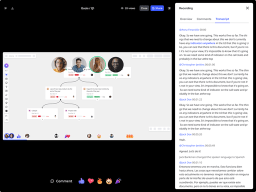 Hyödynnä välittömiä transkriptioita ja yhteenvetoja, joista tekoäly voi laatia toimintakohteita, projektipäivityksiä ja strategisia oivalluksia suoraan taulullesi.