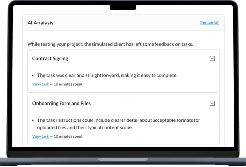 Stop using real clients to test your onboarding. Add simulated, AI clients that interact just like the real thing—completing tasks, sending messages, and surfacing insights about your workflow in minutes, not days.
