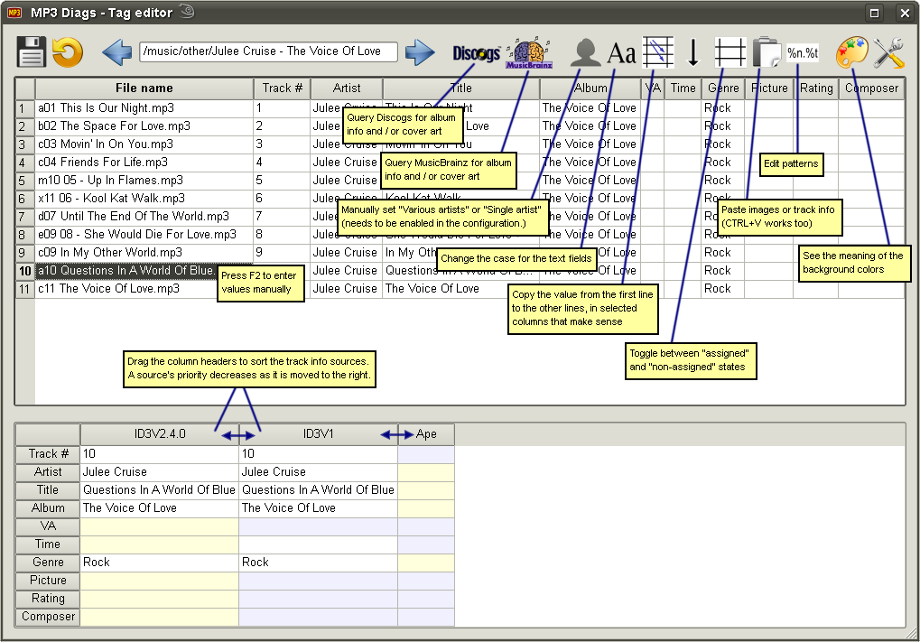 The table below contains the current song. The 10 lines correspond to the 10 fields that the tag editor supports. The columns contain track information as retrieved from various sources: