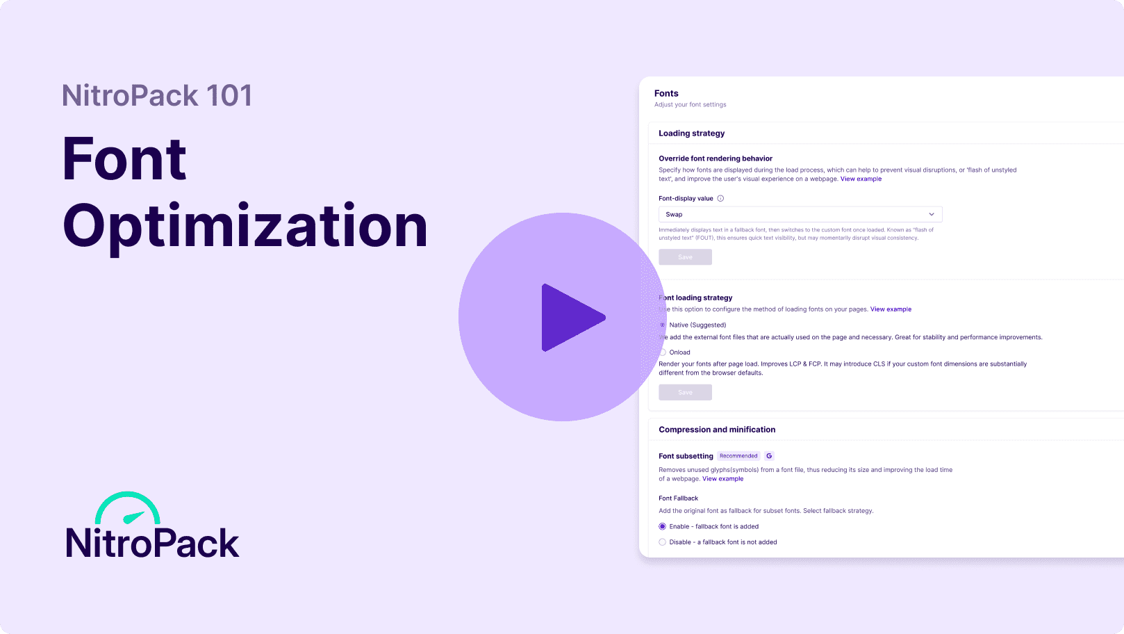 With NitroPack’s complete font optimization, you can deliver lightning-fast text rendering with no visual disruptions. Override rendering behavior, compress fonts, subset unused glyphs, and more—all on autopilot.
