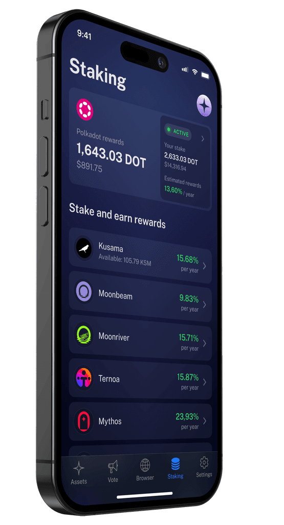 Nova Wallet is a self-custodial Polkadot wallet that enables you to stake directly on the blockchain – this is the safest form of staking with no middlemen who can steal your tokens!