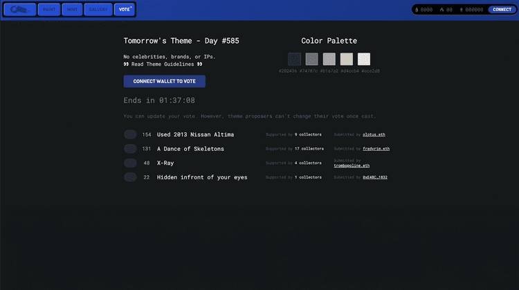 All you need to cast your vote is your BasePaint artwork NFTs. The more NFTs you have, the higher your voting power (according to the rules of Quadratic voting). For now, you can only vote for one theme per day, but we are working on many improvements to the flow.