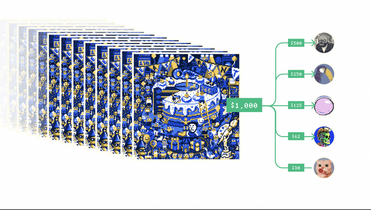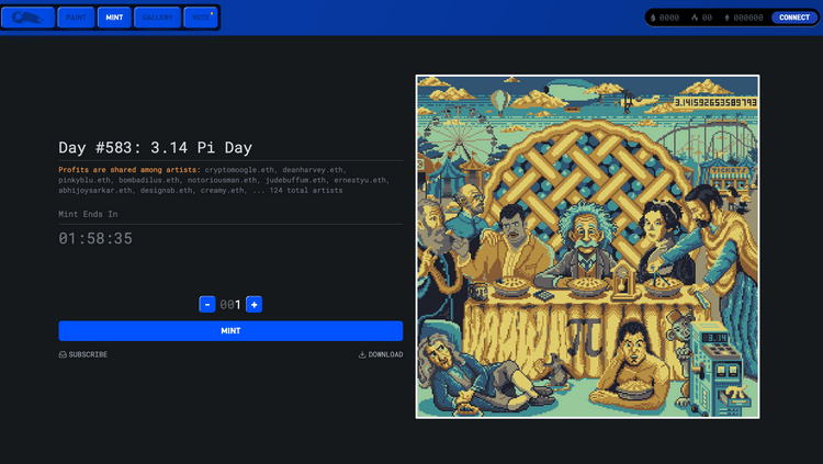 After which, the canvas locks, and an open edition NFT of the artwork is available to mint for 24 hours. 90% of the profits of the OE are distributed to the artists proportional to the number of pixels they painted. 10% goes to the protocol.