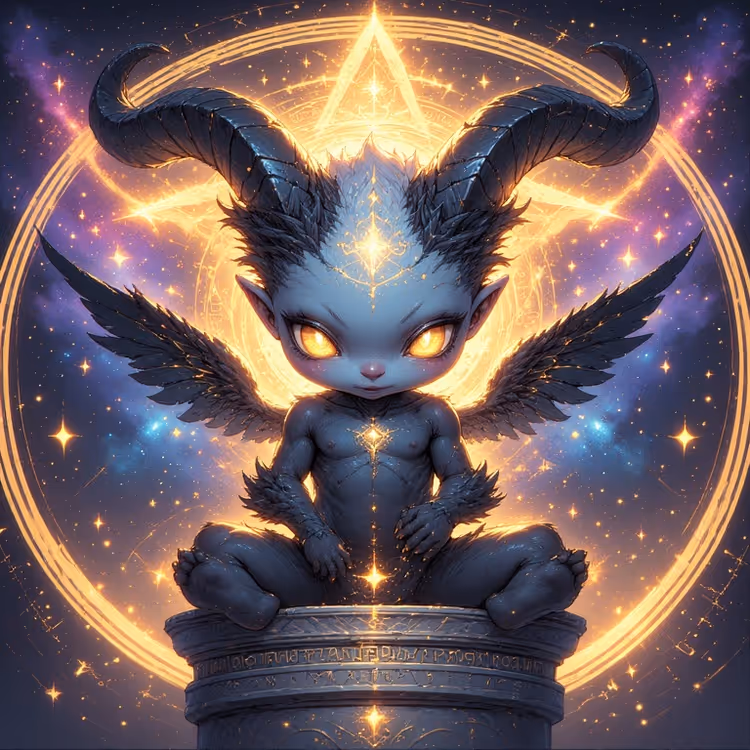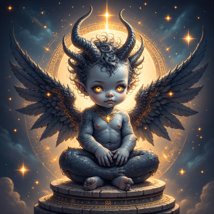 A celestial newborn sitting in silence, its dark wings stretched wide as glowing golden eyes pierce through the cosmic void. Tiny horns crown its head, symbols of power and mystery, while sacred runes shimmer beneath the stone pedestal where it rests. This artwork embodies the dual essence of innocence and enigma — a childlike figure born from starlight and shadow, carrying both purity and ancient wisdom.