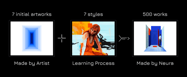 Here, every painting is a collaboration between Neura and 6 incredible artists, who created one piece and let Neura learn their style.