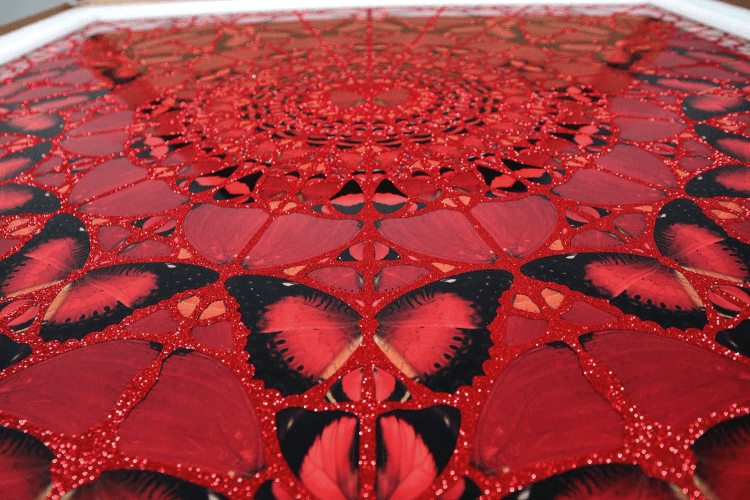 The Empresses prints are symmetrical, asymmetrical, and spiral patterns of meticulously organised butterflies that nonetheless exude hope and life – the butterflies feel as if they are taking flight. This effect is in part aided by the material, laminated Giclée print on aluminium composite, screen printed with glitter, which allows the butterfly wings to be presented in such detail that they appear lifelike.