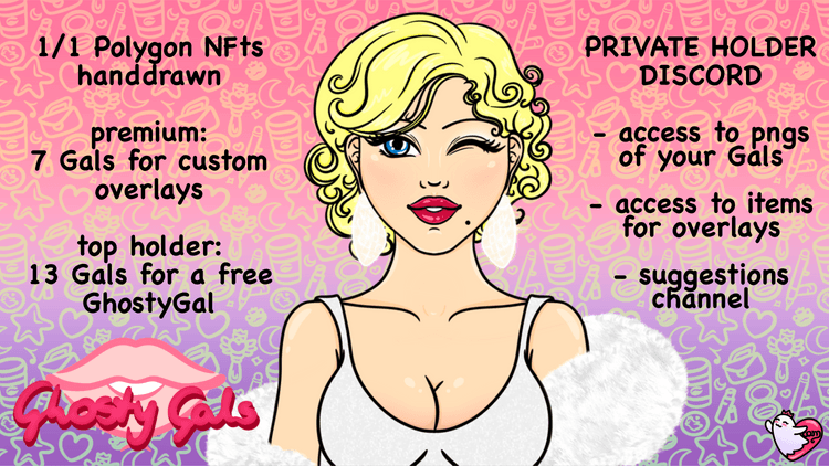 GhostyGals were created by Ghostcam. They are hand drawn 1/1 NFTs on POLYGON. Collect the GhostyGalsGifts, collectable things exclusively airdropped to holders.