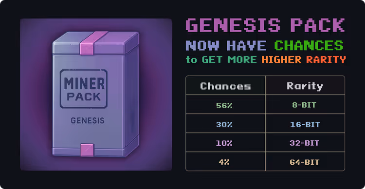 Chances: 56% from Genesis Pack Hashpower: Depends on chain Consumption: 75% Claim Type: Consumes its own token Slot Use: 1 Rarity: 8-BIT Note: The image contains only 1 sample Miner