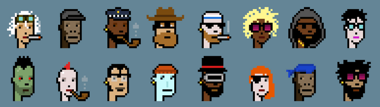 CryptoPunks are 24x24 pixel art images, generated algorithmically. Most are punky-looking guys and girls, but there are a few rarer types mixed in: Apes, Zombies and even the odd Alien.