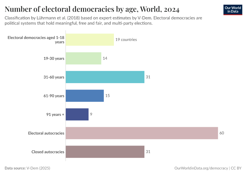 On this page, you can find data, visualizations, and writing on how democracy has spread across countries, how it differs between them, and whether we are moving towards a more democratic world.