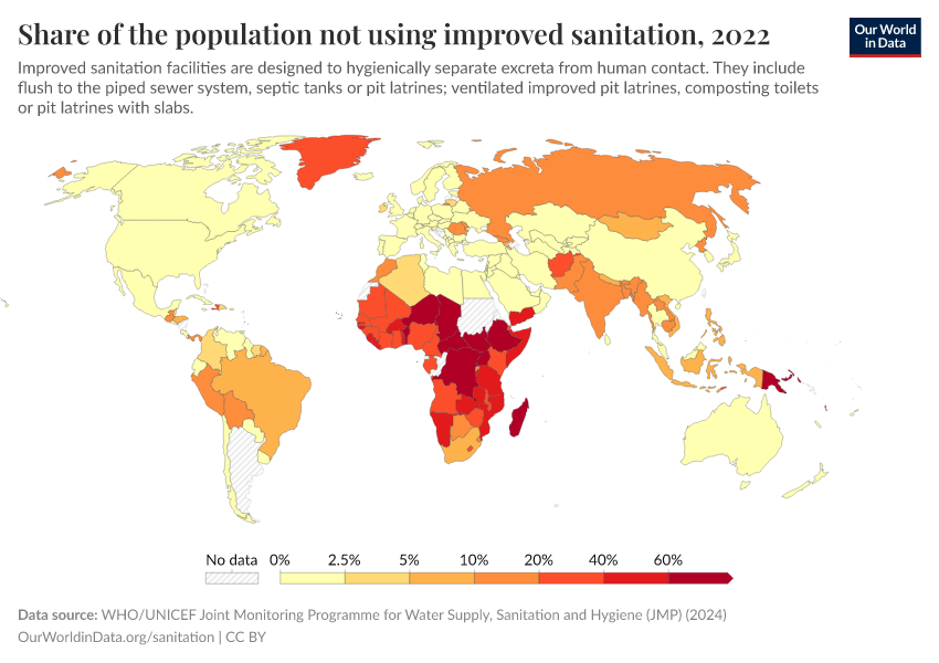 In the map shown, we see the share of people across the world who do not use improved sanitation.