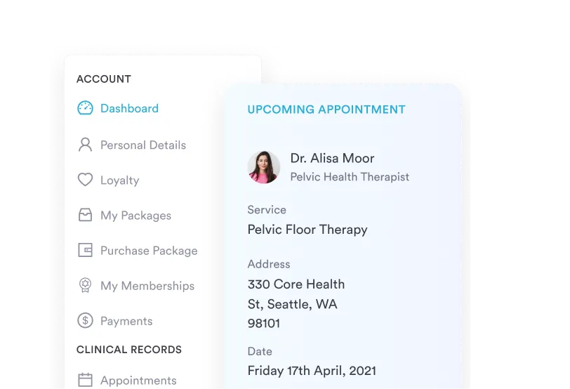 Through automatic aftercare, give clients access to a home exercise library including pelvic floor muscle exercise videos, ensuring they stay on track between visits.