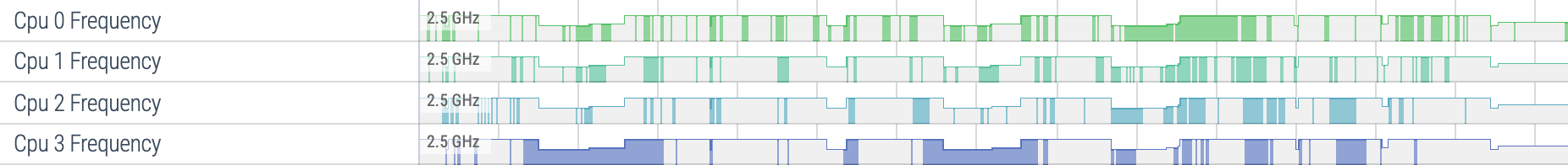 power/cpu_frequencyftrace event. (See TraceConfig below). This will record an event every time the in-kernel cpufreq scaling driver changes the frequency. Note that this is not supported on all platforms. In our experience it works reliably on ARM-based SoCs but produces no data on most modern Intel-based platforms. This is because recent Intel CPUs use an internal DVFS which is directly controlled by the CPU, and that doesn't expose frequency change events to the kernel. Also note that even on ARM-based platforms, the event is emitted only when a CPU frequency changes. In many cases the CPU frequency won't change for several seconds, which will show up as an empty block at the start of the trace. We suggest always combining this with polling (below) to get a reliable snapshot of the initial frequency. - Polling sysfs by enabling the