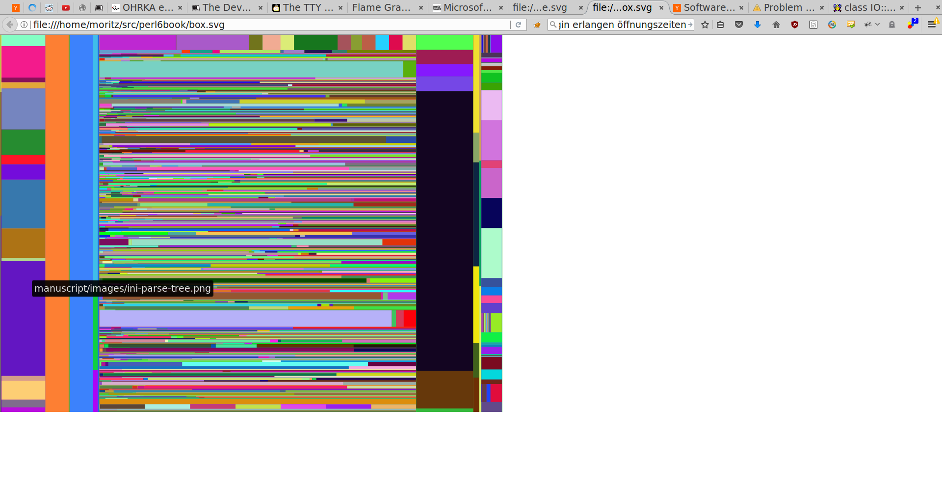 Four events stand out in my memory. In 2010 I was invited to the Open Source Days in Copenhagen. I missed most of the conference, but spent a day or two with (if memory serve right) Carl Mäsak, Patrick Michaud, Jonathan Worthington and Arne Skjærholt. We spent some fun time trying to wrap our minds around macros, the intricacies of human and computer language, and Japanese food. (Ok, the last one was easy). Later the same year, I attended my first YAPC::EU in Pisa, and met most of the same crowd again -- this time joined by Larry Wall, and over three or four days. I still fondly remember the Perl 6 hallway track from that conference. And 2012 I flew to Oslo for a Perl 6 hackathon, with a close-knit, fabulous group of Perl 6 hackers. Finally, the Perl Reunification Summit in the beautiful town of Perl in Germany, which brought together Perl 5 and Perl 6 hackers in a very relaxed atmosphere.