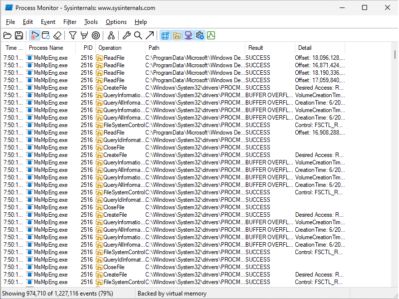 Process Monitor is an advanced monitoring tool for Windows that shows real-time file system, Registry and process/thread activity. It combines the features of two legacy Sysinternals utilities, Filemon and Regmon, and adds an extensive list of enhancements including rich and non-destructive filtering, comprehensive event properties such session IDs and user names, reliable process information, full thread stacks with integrated symbol support for each operation, simultaneous logging to a file, and much more. Its uniquely powerful features will make Process Monitor a core utility in your system troubleshooting and malware hunting toolkit.