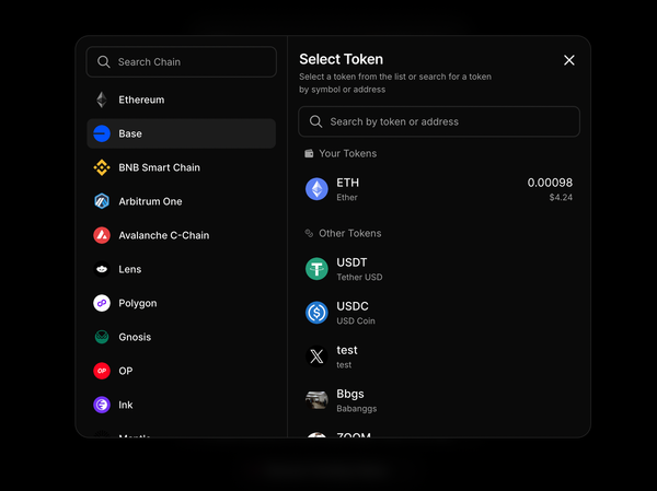 Clicking on the selected token opens a Modal that allows changing the selected chain and token. chain, and amount props are now optional