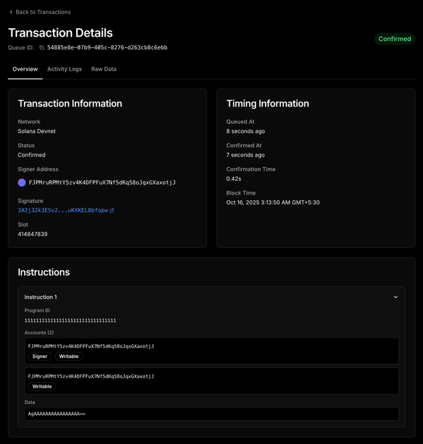 For advanced use cases, submit custom Solana transactions with one or more instructions. This gives you full control over program interactions.