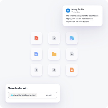 Make edits, share feedback, and manage folders with clients and colleagues — even if they don’t have a Proton Account. Updates sync in real time, keeping everyone on the same page, no matter where you are.