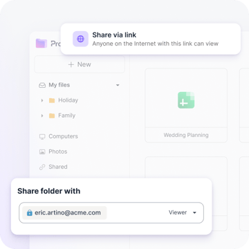Speichere und teile sicher Dateien jeder Größe und Art, von Finanzdokumenten bis hin zu Urlaubserinnerungen. Mit Proton Drive behältst du die Kontrolle mit Passwörtern, ablaufenden Links und der Möglichkeit, den Zugriff jederzeit zu widerrufen.