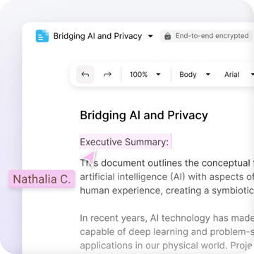 Schreibe, bearbeite und teile Ideen mit dem Online-Dokumenteneditor von Drive. Egal, ob du eine Reise planst oder an einem Projekt arbeitest: Docs hält alle auf dem gleichen Stand und schützt gleichzeitig deine Ideen vor Datenlecks, Online-Überwachung und KI-Training.