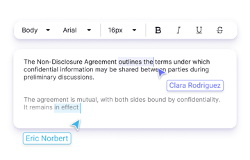Let collaborators propose edits without changing the original text. Their suggestions appear as highlighted text, making them easy to review, accept, or reject.