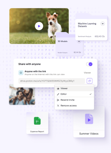 Proton Drive’s flexible file-sharing options put you in control. Send files of any size or type to anyone — even if they don’t have a Proton Drive account