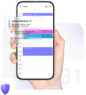 Comme tous les produits Proton, notre calendrier vous permet de contrôler le respect de votre vie privée. Votre emploi du temps, vos réunions, vos projets et vos événements restent privés, tous sécurisés par un chiffrement de bout en bout.