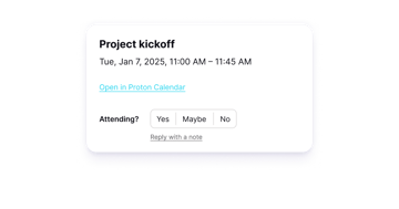 Hantera din kalender sömlöst tillsammans med din e-post. Skicka mötesinbjudningar säkert via e-post, och lägg till händelser i din kalender direkt från Proton Mail.