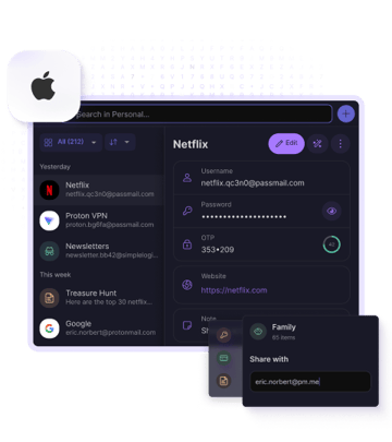 Proton Pass låter dig säkert dela lösenord, kreditkort eller anteckningar med familj, vänner eller kollegor, även om de inte använder denna lösenordshanterare för Mac. Du kan dela enstaka objekt via end-to-end-krypterade länkar, eller bevilja åtkomst till ett valv med flera objekt genom att ange e-postadresser. Dessutom kan du ställa in utgångsdatum, begränsa visningar, hantera åtkomstkontroll och återkalla åtkomst när som helst.