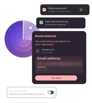 Part of our Pass Monitor security feature, Dark Web Monitoring continuously scans online databases for any instances where your email addresses — and any associated information, such as credit card details — have been exposed in data breaches. This applies to Proton’s 19 email domains (such as @pm.me or @protonmail.ch) and, for paid plans, to custom email domains with your consent. If your data is compromised, you’ll receive a prompt alert, allowing you to act quickly to prevent identity theft or unauthorized access.