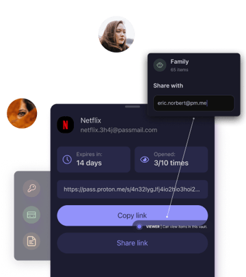 Securely share passwords, credit cards, or notes with others, even if they don’t use Proton Pass. Share single items via end-to-end encrypted links, or grant vault access by email, with options to set expirations, limit views, control access, and revoke it anytime.