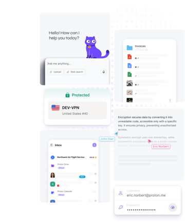 A segurança da Proton começa com a encriptação ponto a ponto. Ninguém — nem mesmo a Proton — consegue ver os seus e-mails, eventos de calendário, ficheiros e outros dados armazenados nos nossos servidores.