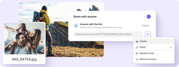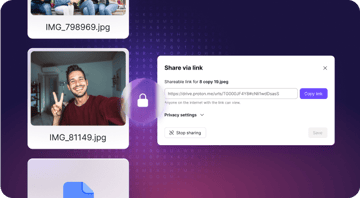 Proton Drive ile güvenli dosya paylaşım bağlantılarıyla fotoğraf paylaşabilir, parolalar veya geçerlilik süresi tarihleri belirleyebilir ve erişim iznini istediğiniz zaman geri alabilirsiniz.