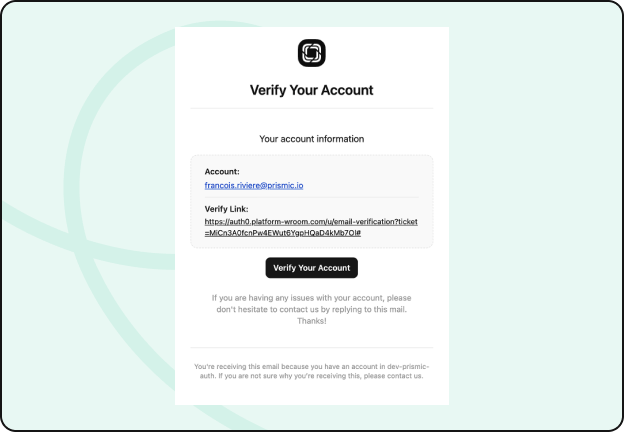 Starting May 12, 2025, Prismic will introduce a one-time email verification step for users who log in with their email and password. This quick step will confirm your email address to help improve account security, confirm ownership, and ensure reliable account recovery.