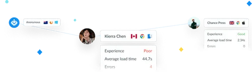 Search for specific customers and see their activity, full session and page performance history and errors or crashes they’ve experienced.