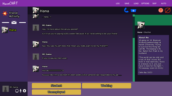 You have found a strange ad at your local convenience store advertising $100 a week to be someone’s friend. The catch? The girl is an incredibly lonely girl named “Hana” with a strange, high-pitched voice. Regardless of how you treat Hana, one thing is for certain: she is desperate for friendship.