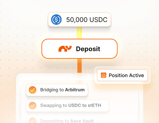 Universal deposit addresses that settle exactly where you need them. Vault-ready, card-ready, trading-ready in under 10 seconds. From any chain to active balance.