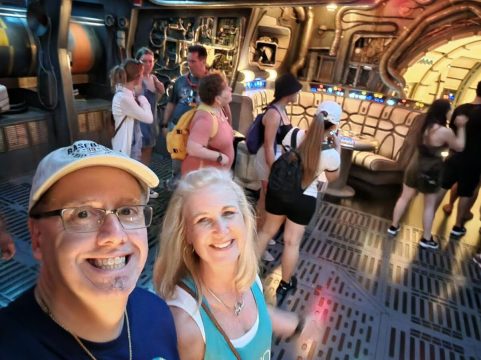 Then there’s Smugglers Run, also a must-do for your chance to be either pilots or gunners inside the Millennium Falcon. TJ and I were pilots and we wrecked the snot out of Han’s trusty space bird. We brag on it, actually. Here’s a pro tip given to us by the park cast members… Wait until 2:00-3:00 as people are either eating or park hopping, or at the end of the day when visitors are chasing after the fireworks shows and you’ll have far less time to wait.