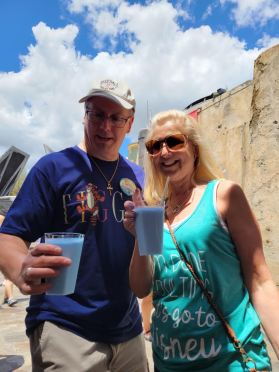 Much of Galaxy’s Edge is breathtaking to behold with its creation of a craggy landing zone on the attraction-named planet Batuu. We wandered about the Black Spire Outpost, intimidated more by the prices for swag and refreshment and the excruciating wait times for the damned spectacular Rise of the Resistance and Smugglers Run rides than we were by the random appearances of Kylo Ren and his First Order stormtroopers. TJ had a playful verbal scrum with Kylo, who came no further than his stage as we partook the famous “blue milk,” which you can have laced with rum. A whopping $15.00 a pop each (rum version), we plunked the money like chumps for the sheer novelty of it.